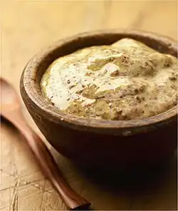 The mustard is traditionally made with brown mustard seeds which have been marinated in vinegar, often white wine vinegar, horseradish and assorted spices before being packed or ground.[1][2] It owes its grainy appearance to the use of coarse-ground mustard seeds.[3]