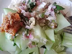 Creole sauce, also referred to as "red gravy", creole tomato sauce, and sauce piquante in New Orleans, is a Creole cuisine, Haitian cuisine, and New Orleans cuisine sauce made by sauteeing vegetables in butter and olive oil. It is used in the American south. It is made with tomatoes, the Cajun holy trinity (celery, bell peppers, and onions), garlic, seasonings, and herbs.[1][2] Stock (usually chicken) is also used, and it is seasoned with cayenne, hot sauce, bay leaf, salt, black pepper, thyme, and parsley.[3]