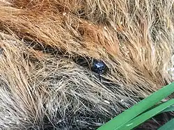 Creophilus oculatus is a carrion beetle, often been collected from carrion, carrion-baited pitfall traps, or rotting plants, to which it is attracted by smell.[4][9] The adults are one of the first insect species to arrive at a dead animal. Rather than feed directly on carrion, they consume carrion-feeding insects, especially the maggots of blowflies, and have been observed tearing open flies with their curved jaws to feed on their eggs.[7] These beetles discharge an unpleasant-smelling white substance—described as smelling like "rotten fish"[9]—from glands on their abdomen when threatened.[4]