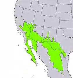 Larrea tridentata is a prominent species in the Mojave, Sonoran, and Chihuahuan Deserts of western North America, and its range includes those and other regions in portions of southeastern California, Arizona, southern Nevada, southwestern Utah, New Mexico, and Texas in the United States, and Chihuahua, Sonora, Coahuila, Nuevo León, Zacatecas, Durango and San Luis Potosì in Mexico. The species grows as far east as Zapata County, Texas, along the Rio Grande southeast of Laredo near the 99th meridian west.[6]