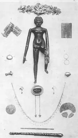 Near the doll were discovered the remains of an ivory casket[10] also originally believed to be wood. Remounted over a perspex structure, it belonged to the doll's kit. On one of its thumbs, the doll had a key ring inserted of the type used by the Romans for jewelry boxes.[3] Other toys found in the sarcophagus and part of the doll's kit were two silver mirrors and two tiny bone combs.[3] The above-mentioned gold ring of the key type, another with a bezel, two tiny pierced pearls, part of earrings, a pearl and two glass paste beads, plus remains of golden spirals belonging possibly to a necklace were also part of the doll's kit.[3][13][14]