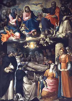 He worked alongside Rutilio Manetti for some projects. He frescoed the ceilings for the Oratory of San Rocco.[2] He also painted for the Oratory of St Catherine of Siena, two canvases depicting: St Catherine offers her garments to Jesus appearing to her as a poor pilgrim and Jesus offers St Catherine a crucifix.[3] He painted a St Bernardino of Siena pleads before Pope Martin V for San Domenico, Siena.[4] He also painted an altarpiece for the church of San Martino, Siena.[5]