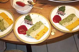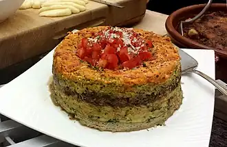 The dish is usually baked and inverted. It comprises a minimum of three or four layers of different colored omelettes, often given by red tomatoes, orange carrots, green spinach or chard, and black olives. Peppers, with their variety of colors also allows for multicolored crespéou. Some preparations use sausage or sliced fish for a beige layer. In Nice, there is always an omelette made from chard ribs.[1] Other vegetables can be used, such as zucchini, eggplant, onion, or basil.[3]