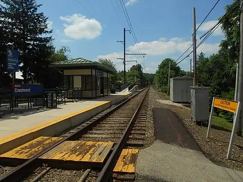 Crestmont station is a railroad station in the Crestmont section of Abington Township, Montgomery County, Pennsylvania on SEPTA's Warminster Line, formerly the Reading New Hope branch. It is located at the intersection of Rubicam Avenue and Rockwell Road. The station parking lot has 24 spaces. The station contains no ticket or station facilities and consists only of a shelter. SEPTA rebuilt the platform and waiting shelter in 2009.[2] In FY 2013, Crestmont station had a weekday average of 89 boardings and 91 alightings. This station is wheelchair ADA accessible.[3]