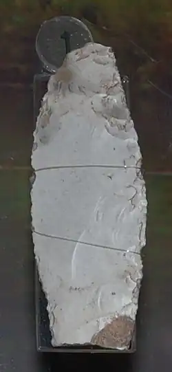 ^The museum's exhibit label says "Leaf-points were probably spear tips. They are one of the earliest recognisable objects made by fully modern humans in Britain. This is a particularly good example. c. 38–35,000 years old"