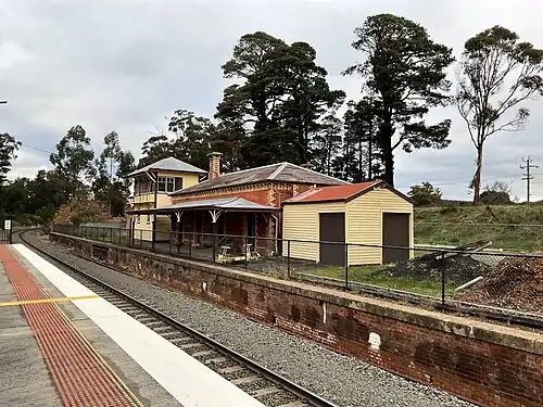 The new platform is on the eastern side of the line, with a steel shelter provided for waiting passengers. The former station building, platform and signal box are on the western side of the line, with a pedestrian subway passing underneath the tracks at the southern (up) end. The original station building is listed on the Victorian Heritage Register.[5][6] There is a goods shed on the site, but no tracks are connected to it.