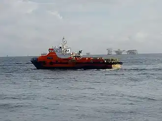 A crew boat, also called a crewboat, crew transfer vessel, fast support vessel, fast supply vessel or fast intervention supply vessel, is a vessel specialized in the transport of offshore support personnel, deck cargo, and below-deck cargo such as fuel and potable water to and from offshore installations such as oil platforms, drilling rigs, drill and dive ships or wind farms.[1]