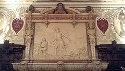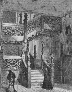 The interior of Crewe Hall contains a mixture of original Jacobean work, faithful reproductions of the original Jacobean designs (which in some cases had been recorded), and work in the High Victorian style designed by Barry.[4][14] The entrance hall in the east wing was remodelled by both Edward Blore and Barry. It is panelled in oak and contains a marble chimneypiece with Tuscan columns featuring the Crewe arms.[1] It opens via a columned screen into the central hall, which was an open courtyard in the Jacobean house.[1][14] Roofed by Blore at the first-floor level, Barry converted the space into an atrium featuring cloisters around the walls, with a wooden gallery over them at the mezzanine level and a tunnel-vaulted first-floor gallery above. The floor is paved with a pattern of coloured marbles and the first-floor gallery corridors have stained glass panels. The atrium has a hammerbeam roof supported by columns at the gallery level.[1][4][14] To the east of the central hall is an accurate reconstruction by Barry of the original staircase, which Nikolaus Pevsner described as "one of the most ingeniously planned and ornately executed in the whole of Jacobean England."[2] Heavily carved, the newels feature heraldic animals, which were originally gilded and painted.[1][4]
