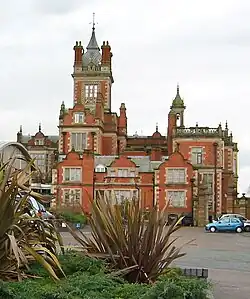 The former stables, in red brick with a tiled roof, were completed around 1636 and are contemporary with the Jacobean mansion; they are listed at grade II*. They form a quadrangle immediately to the west of the hall, enclosing a rectangular courtyard. The main east face of the quadrangle stands at right angles to the front of the house; it has nine bays of two storeys and an attic.[69] Its centrepiece, added by Edward Blore in around 1837, consists of an arched stone entrance flanked by pilasters, above which a clock tower rises from the first-floor level.[69][70] The tower features twinned arrow-slit windows and clock faces with stone surrounds, and is topped by a bell chamber and ogee cupola with finials. In addition to the centrepiece, the east face has four bays which are set forward and have shaped gables topped with finials. The north and south ends of this east building also have shaped gables.[69]