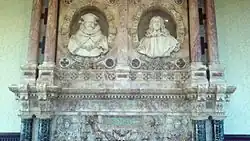 The long gallery, along the north side, has a chimneypiece in coloured marbles with busts by Henry Weekes depicting Sir Randolph Crewe and Nathaniel Crew, 3rd Baron Crew, Bishop of Durham.[4][14] The library, above the carved parlour, contains statuettes of book lovers by Philip and a frieze of scenes from literature by J. Mabey.[4][14] The drawing room has a facsimile of the Jacobean ceiling, which had been recorded by architect William Burn. Identical in pattern to one at the Reindeer Inn in Banbury, of which the Victoria and Albert Museum has a plaster cast, it was presumably originally the work of the same craftsman.[4][68] One of the state bedrooms has another survivor of the fire, a Jacobean stone fireplace with a plaster overmantel relief depicting Cain and Abel.[4][14]