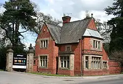 The park has two gate lodges; both are listed at grade II.[73][74] The northern lodge at Slaughter Hill is by Blore and dates from 1847. In red brick with darker-brick diapering, stone dressings and a slate roof, it has a T-shaped plan with a single storey, and is Jacobean in style. It features two shaped gables, each decorated with a panel carved with Crewe Estate emblems, and a hexagonal central bay with a pyramidal roof which forms a porch.[70][73] The Elizabethan-style Weston or Golden Gates Lodge to the south of the house dates from before 1865 and is attributed to William Eden Nesfield, although it is not typical of his style. In red brick with blue-brick zig–zag diapering, ashlar dressings and a slate roof, the lodge has two storeys, with a projecting canted bay to the road face. The driveway face has an ashlar panel with a shield bearing the Crewe family coat of arms.[70][74]