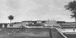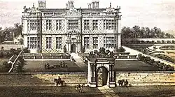 Hearth-tax assessments of 1674 show the original hall to have been one of the largest houses in Cheshire, its 42 hearths being surpassed only by Cholmondeley House and Rocksavage, neither of which have survived.[55] As depicted in a painting of around 1710, the original building was square with sides of around 100 feet (30 m), and featured gabled projecting bays and groups of octagonal chimney stacks. Built around a central open courtyard, the interior had a great hall and long gallery; the main entrance led to a screens passage and the main staircase was in a small east hall.[4][55] Externally, there was a walled forecourt and formal walled gardens; a range of separate service buildings was located to the west.[4][56]