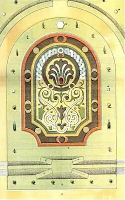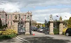 The entrance gates and wall separating the gardens from the park and farmland date from 1878 and are listed at grade II.[85] The wrought-iron gates are by Cubitt & Co., and were exhibited at the Paris Exhibition of 1878.[4] Two outer single gates and a double inner gate are supported by four sandstone piers. The outer pair of gate piers are capped by a bud-shaped device supported on scrolls; the inner pair are surmounted by a griffin and a lion, mirroring the statuary of the hall's terraces. The lower gate sections of lyre-like panels with leaf and spearhead motifs are topped with Jacobean-style arched panels. The ornate gate overthrows include shields and emblems capped with crowns, sheaves and sickles.[85] The inner gates bear the inscription Quid retribuam domino ("What can I render to the Lord?"), while the outer gates bear the date.[56][85] The wall, of brick with stone dressings, features arcading and has piers surmounted with ogee caps carved to match the tiles of the main hall tower.[85] A further feature of the gardens to survive is a grade-II-listed sundial dating from the early 19th century, which stands to the rear of the house.[86]