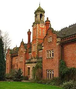 The western wing is dominated by a square tower of stone-dressed brick which rises two storeys above the roof and is capped by an ogee spirelet surrounded by four corner chimneys. Designed by Barry in the High Victorian style, it was added after the fire.[1][14][27] A slender bell tower also rises from the west wing. At the rear is a loggia with a vaulted ceiling supported by Tuscan columns.[1][4] The western end of this wing is a single-storey extension by Thomas Bower dating from 1896.[14]