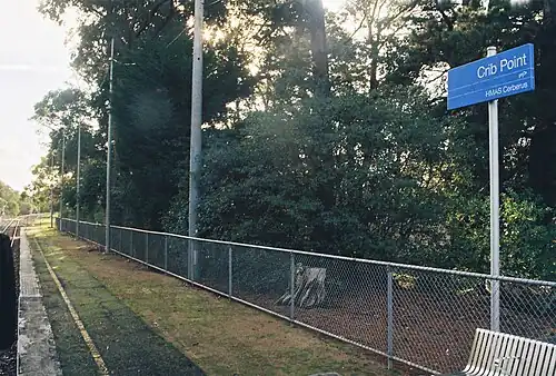 Crib Point railway station is a commuter railway station on the Stony Point line, part of the Melbourne railway network. It serves the town of Crib Point in Victoria, Australia. Crib Point is a ground level unstaffed station, featuring one side platform. It opened on 17 December 1889, with the current station provided in 1986. It initially closed on 22 June 1981, then reopened on 27 September 1984.[3]