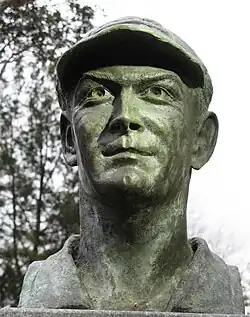 The nearby statue by Valerius[2] (shown below) of Bradman in action was unveiled during the celebrations for "Sir Don"'s 92nd Birthday in August 2000.[3] A minor mystery surrounds the Brian Booth sculpture, similar in style to others by Valerius, but not credited in the official documentation. There is no obvious clue in the plaques, which have remained uniform in style and execution over 30 years.