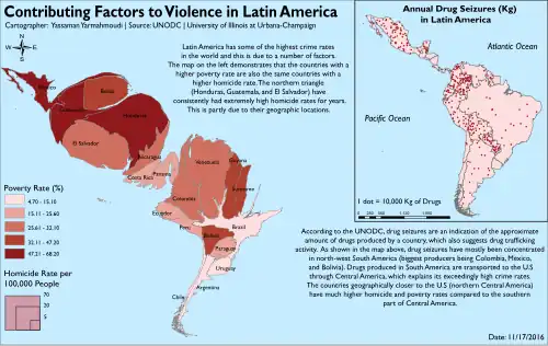 High rates of crime and violence in Latin America are undermining growth, threatening human welfare, and impeding social development, according to World Bank and the United Nations Office on Drugs and Crime (UNODC).[5] According to the Financial Times, "The region registers close to 40 percent of the world’s murders despite being home to only 9 percent of the global population. According to LAPOP, one in four Latin Americans was assaulted and robbed" in 2018.[6] Latin America is caught in a vicious cycle, where economic growth is thwarted by high crime rates, leading many to believe that because of the insufficient economic opportunity in the region, Latin America cannot navigate their way out of the problem. However, there are many contributing factors to the problem of crime and violence in Latin America, such as the Drug Trade, Cartels and corruption in the political and judicial systems.[7] Crime and violence thrives as the rule of law is weak, economic opportunity is scarce, and education is poor. Therefore, effectively addressing crime requires a holistic, multi-sectoral approach that addresses its root social, political, and economic causes.