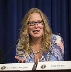 With Thomas Kalil, Dorgelo led the White House's "Grand Challenges".[15][16] Incentive prizes and Grand Challenges were both part of Barack Obama's innovation strategy, aiming to catalyze breakthroughs towards national priorities.[17] The Obama administration's Grand Challenges included the BRAIN Initiative, the United States Department of Energy SunShot Initiative and EV Everywhere Challenge, NASA's Asteroid Grand Challenge and United States Agency for International Development Grand Challenge for Development.[17][18][19] She was interested in engaging citizens broadly in efforts to address Grand Challenges.[20] Through her role in the Grand Challenges she became interested in citizen engagement.[21] In 2013 she delivered a FED Talk on engaging the public in Grand Challenges, and in 2014, she delivered a keynote address on Grand Challenges at the Department of Energy's SunShot Grand Challenge Summit.[21] She was named a “Tech Titan” in 2013 by Washingtonian Magazine,[22] and in 2014 Fedscoop named her one of Washington DC's “Top 50 Women in Tech".[23] Dorgelo helped start "We the Geeks," a White House series of Google Hangouts that highlighted the future of science, technology, and innovation here in the United States.[24]
