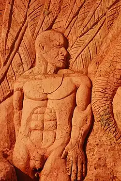 As people ascend the hill they can see the work of artist Carlos Andrés Gómez, who for two years sculpted his work on 34 ravines.[5] This work is known as the biblical scenes of Golgotha. In the first canyon carved Existence, as a tribute to life and man; in the second, the Lament of the Pacha Mama, as a protest of nature for the damage that man has done to the environment; in the third gave life to Golgotha, to accompany the faithful make pilgrimage at Easter. In the fourth ravine is The Garden of Eden.
