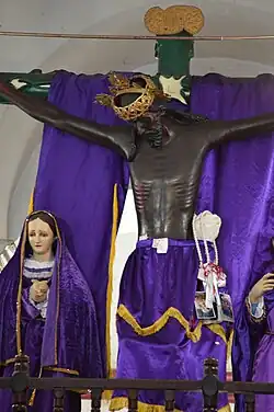 The Cristo Negro of Otatitlán is in the parish church of the town.[17] There are two stories of the origin of this particular image. One states the Spanish king Philip II had the three Black Christ images commissioned, which then went on to their current locations.[18] Another story says that the image was found on the Day of the Cross by an indigenous person at the foot of a tree in the village of Puctlanzingo, which was then claimed by the Mazatecos of the region. Later it was moved on the Papaloapan River on a raft to its current location.[17][18] During the Cristero War in the 1930s, the image was taken by men allied with then governor of Veracruz, Adalberto Tejada, who tried unsuccessfully to burn it. Instead it was decapitated. The headless image returned to Otatitlán and a replacement was made. In 1950, the original head was found and returned, with the replacement head now kept in a glass case.[17][19] The devotion to this image is a syncretism. It is not unusual for there to be a mass followed by a ritual cleansing by a local “brujo” (roughly witch doctor).[17] The major feast day for this image is May 3, Day of the Cross, with events beginnings on April 28 and extending to May 7. The event can attract up to 150,000 people from Veracruz and other parts of Mexico.[18]