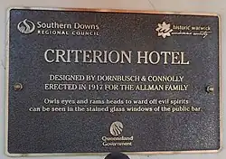 - It is important in demonstrating the evolution or pattern of Queensland's history: The erection of the hotel in 1917, replacing an earlier hotel building, is important in demonstrating the high level of building activity in Warwick town during the early twentieth century when many of the general stores and hotels were re-built or renovated. The Criterion Hotel has an association with the Allman family, who ran other hotels in Warwick during this period, and who were actively involved in the development of Warwick from the 1880s.[1]