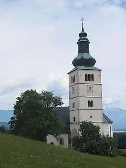 The church's artwork includes a painting of Holy Sunday from the workshop of Johannes of Ljubljana (c. 1460), a Gothic painting of Saint Christopher on the south wall from 1464, a painting of Saint Christopher on the bell tower, and remnants of frescoes from the 14th and 15th centuries on the north wall of the nave. There are four 17th-century gilded altars where the nave meets the chancel; above the altar dedicated to Saint Martin there hangs a whale rib, referred to as the rib of a giantess in popular tradition. The main altar was created in 1652 by the Ljubljana sculptor Jurij Skarnos and was gilded by Jakob Jamšek of Škofja Loka. The forged railing in front of the main altar was created by the Škofja Loka locksmith Gregor Jesenko.[5] The Baroque organ, work by the organ builder Joannes Franciscus Janecheck, dates to 1743.[13]