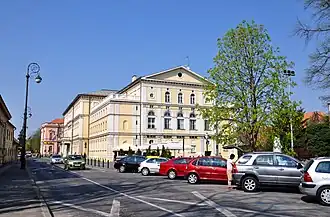 The theatre building, designed by Viennese architect Hermann Helmer, was completed in 1873.[3] The theater in Varaždin was the third theatre building in Civil Croatia.[2] The first professional Croatian theater ensemble was formed in 1898 under the management of the Croatian Drama Society, led by historian Ivan Mičetić.[3] The Permanent City Theater as an institution was officially established in 1915, featuring both a drama and an opera ensemble.[2] This institution was active until 1925.[3] Between 1907 and 1942 Varaždin served as the secondary base for the Croatian National Theatre in Osijek.[1] The city theatre was also used for marking special occasions of the city Gymnasium later in the interwar period.[4] After World War II in Yugoslavia, the professional National Theater "August Cesarec" was established, with support from the Slavonian regional authorities.[1]