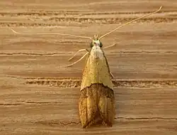 The wingspan is 13–15 mm (0.51–0.59 in). The forewings are rather deep yellow with ochreous-fuscous markings, with purple reflections. There is a costal streak from the base to two-fifths and a patch occupying the terminal half of the wing, the anterior edge straight or seldom bent, irregular, dark fuscous, running from the middle of the costa to beyond the middle of the dorsum, enclosing a roundish suffused central deep yellow blotch. The hindwings are whitish-yellowish, posteriorly suffused with fuscous, darker towards the apex. There is a dark grey transverse discal mark.[2]