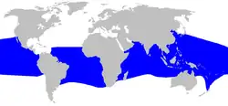 The crocodile shark is almost circumtropical in distribution. In the Atlantic Ocean, it is known from off Brazil, Cape Verde, Guinea-Bissau, Guinea, Angola, South Africa, and Saint Helena Island, though it has not yet been reported from the northwestern Atlantic. In the Indian Ocean, it occurs in the Mozambique Channel and possibly the Agulhas Current and the Bay of Bengal. In the Pacific, it occurs from Japan, Taiwan, and the Korean Peninsula in the northwest, southward to Indonesia, Australia, and New Zealand, and eastward to the western coast of the Americas from Baja California to Chile, including the Marshall, Phoenix, Palmyra, Johnston, Marquesas, Line, and Hawaiian Islands in between.[5][8][9][10] In New Zealand this species has been recorded at the Three Kings Ridge, off the coast of Northland and on the northern Kermadec Ridge.[11]