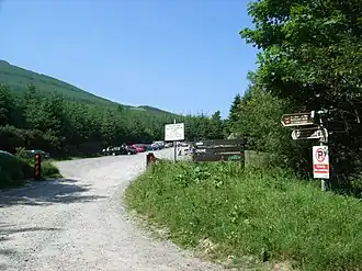 Crone Woods is an access point to the Wicklow Way, the oldest long-distance trail in the Republic of Ireland, which extends for 131 kilometres (81 mi) from its starting point in Marlay Park in South Dublin to Clonegal Village in County Carlow.[2] The wood is also used by hill-walkers completing the 16-kilometre loop of Maulin, Tonduff 642 metres (2,106 ft), War Hill 686 metres (2,251 ft) and Djouce 725 metres (2,379 ft), which is sometimes called the 'Circuit of Glensoulan'.[4]
