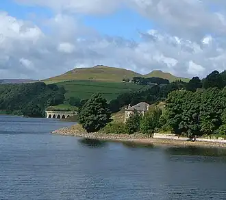 The hill is situated above the A57 Snake Pass road between Sheffield and Manchester as it passes Ladybower Reservoir. Crook Hill is regarded as an outlier of Kinder Scout although the two are separated by the long western arm of Ladybower Reservoir. The hill has twin summits, the highest of which reaches a modest height of 382 metres (1,253 ft) while the secondary top (sometimes referred to as Ladycrook Hill, although this name does not appear on Ordnance Survey maps) attains an altitude of 374 metres (1,227 ft). The actual high point of the ridge is Bridge-end Pasture, at 391 metres (1,283 ft) above sea level, which is about 1 km north east.[1][2][3]