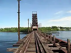 The Crook Point Bascule Bridge (or the Seekonk River Drawbridge) is a defunct Scherzer rolling lift railway bridge that spans the Seekonk River, connecting Providence, to East Providence. Since its abandonment in 1976, it has been stuck in the open position and is known to nearby residents as the "Stuck-Up Bridge," having become a local icon of urban decay.[1] In 2022, Providence Journal described the bridge as "a T-shirt-ready symbol of Providence's quirky evolution from industrial to creative hub."[2]