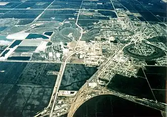 Aerial view of Crookston, Minnesota, with the Red Lake River twisting through the town