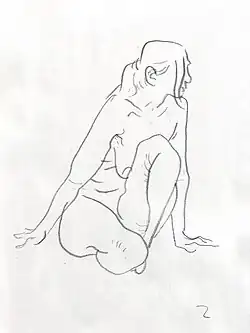 Croquis drawing is quick and sketchy drawing, usually of a live nude model. Croquis drawings are usually made in a few minutes, after which the model changes pose or leaves and another croquis is drawn. The word croquis comes from French and means simply "sketch". In clothing design, a croquis is an outline silhouette, for use by a designer.[1]