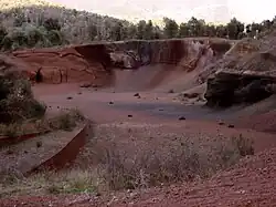 Starting from the 1960s, the northeastern flank of the volcano was quarried for lapilli gravel.[7] The extraction of material from the volcano cone and the degradation of the volcanoes of the Garrotxa Volcanic Field sparked a series of protests in the 1970s to protect the volcanic field, a campaign that came to be known as Save the Volcanoes (Catalan: Salvem els Volcans).[8] The extraction area was also used as an uncontrolled municipal landfill for the city of Olot. In 1982 the Zona Volcànica de la Garrotxa Natural Park was created to protect the area but the extraction lasted for another nine years. Further protests were sparked after an agreement was reached between the concessionaire of the quarry, Minas de Olot, SA, and the Generalitat of Catalonia for the further extraction of 2.7 million tons with educational and scientific purposes, with the commitment of restoration of all excavated areas. The successive non-fulfillment of the restoration program resulted in the issue of at least ten disciplinary proceedings in the subsequent years.[7] The mining operations were stopped in 1991, when the Generalitat of Catalonia acquired the majority of shares of the mining company.[9]