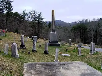 The 84 miners killed as a result of the explosion were buried in several cemeteries in the Briceville-Fraterville area. At least 22 were buried in a circular memorial which became known as the Cross Mountain Miners' Circle. This is located at the south end of Briceville on the steep western slope of Walden Ridge. Shortly after the disaster, the United Mine Workers of America placed a marble obelisk in the middle of the Cross Mountain Miners' Circle containing the names of all 84 miners killed in the disaster.[12] This memorial, around which a large cemetery has developed, was placed on the National Register of Historic Places in 2006. Others were buried at the Briceville Community Church cemetery, among them Eugene Ault, whose monument is inscribed with the "farewell message" he wrote on the wall of the mine as he lay dying.[13]
