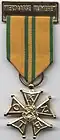 The decoration is a five-armed cross, with each arm bearing an initial of the awarding organisation. It has a width of 36 mm at its widest point and is suspended from a green-and-yellow (often orange-yellow) ribbon. Until 1958 the initials on the five arms read: ‘NBVLO’, with ‘KNBLO’ since 1959 to reflect the Koninklijke (Royal) prefix.[1] There have been other minor changes in design over the years. For example, in 1977 the previous silver gilt and silver crosses were replaced by base metal versions, with other design modifications in order to reduce costs.