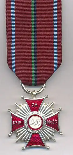 The Cross of Merit for Bravery (Polish: Krzyż Zasługi za Dzielność) is a Polish medal awarded for selfless bravery in the defense of law, national borders, and the life and property of citizens in especially difficult circumstances.