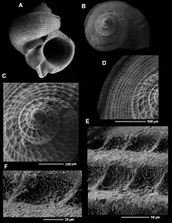 Sculpture : the upper whorls carry three thick, elevated, spiral ribs, divided by broad, deep grooves. These vanish on the body whorl, which is entirely covered by dense, microscopic spirals so crossed by radials as to give the effect of fine punctures over the whole surface. The basal funicle is massive, coiled on the body whorl like a subsidiary whorl, far extended anteriorly, its truncate extremity excavate. A small perforation occurs below the subcircular aperture in the base of the funicle. The simple outer lip simple is inner reflected over the umbilicus. The umbilicus has superiorly a narrow spiral perforation, inferiorly a trough hollowed between the columella and the funicle.[2]