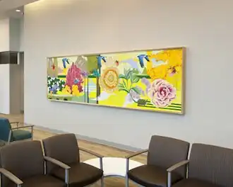 Each framed work measures 158 x 49.5 inches. Inspired by sitting on a porch or gazing out a window, letting the mind wander across the landscape, Nieves created a bright composition of Indiana native flowers and plants by incorporating emblematic images from the Eskenazi Health Art Collection together with Native American and Indiana state symbols incorporated with graffiti shapes, as Ismael Muhammad Nieves comments below: