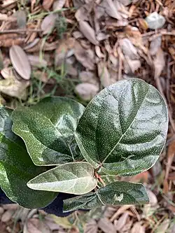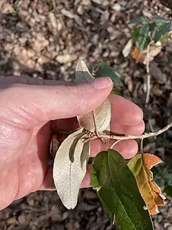 The simple, petiolate leaves are arranged spirally and are found at the ends of stems. Blades measure 3.8 to 9 cm in length and 1.5 to 4 cm in width, have entire margins, and are ovate to elliptic. The apex is acute, rounded, or emarginate, while the base is obtuse to slightly cordate. The tops of the leaves are dark green with scattered silver scales.[4] Leaf undersides are completely covered in scales, most of which are unpigmented,[6] and have prominent veins.[4] Although older leaves turn orange in the fall,[7] it is a semi-evergreen plant because the leaves are retained during mild winters.[8]