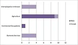 Some data was given in 1881 as to what occupations were held by the people of Croughton. Overall, 19 people, male and female, were accounted for in the data. Compared to the census data of the same year, either the 10 remaining people were unaccounted for, were children or had died by the time the data was collected. The '1881 Data for the occupations of Croughton' chart below shows the data for the 1881 occupational census data for the township of Croughton. Because of Croughton's rural location, it is unsurprising that the majority of people worked in agriculture.[7]