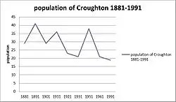 Although the population of Croughton has changed every year of the census, the population has always remained small, giving it a hamlet status. The first recorded census data for Croughton was recorded in 1881, and shows a total population of 29.[10] The graph on the right shows the differences in data. There is no data for 1941 as there was no census recorded during World War II, and data from 1961 to 1991 is unclear. There is no steady pattern in population change.