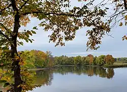 The Crow Wing River is a 113-mile-long (182 km)[5] tributary of the Mississippi River in Minnesota, United States. The river rises at an elevation of about 1391 feet in a chain of 11 lakes in southern Hubbard County, Minnesota, and flows generally south, then east,[6] entering the Mississippi at Crow Wing State Park northwest of Little Falls, Minnesota. Its name is a loose translation from the Ojibwe language Gaagaagiwigwani-ziibi ("Raven-feather River"). A wing-shaped island at its mouth accounts for the river's name.[7] Because of its many campsites and its undeveloped shores, the Crow Wing River is considered one of the state's best "wilderness" routes for canoeists; although it is shallow (seldom more than 3 feet (0.91 m) deep), it is nearly always deep enough for canoeing.[6]