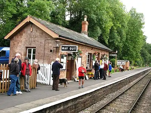 Located in a small local valley, the station stands at the highest point on the line, just under 400 feet (120 m) above sea level.[4] The station has been designated by English Heritage as a grade II listed building.[5] The railway workers' cottages and station master's house, together with the main station building, are the only original structures left. A display of permanent way can be found on the western platform and includes a portion of 7 ft (2,134 mm) broad gauge "baulk road" as was originally used on the line.[3]