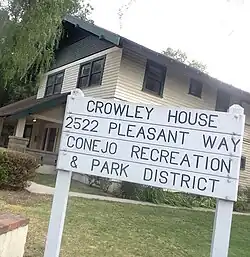 The five-bedroom Crowley House was built on the El Camino Real, on the site of the Newbury Ranch,[2] in 1910 for newlyweds Frank and Mae Casey Crowley.[3] In the 1920s, it was converted into a real estate office. It was nicknamed the "Mother of Thousand Oaks" in 1923 for its role in the development of Conejo Valley housing.[2][3] The home was sold in 1925 to Dr. Eugene Parks, who lived there with his first wife, Jenny, until her death in 1932, and then with his second wife, Marie de Winstanley Parks, in 1934.[2] Marie Parks began using the home as a showplace for her poetry, as she had been named poet laureate of the Conejo Valley for her song, “God of the Conejo,” and other music, dance, and theatrics took place at the home as hosted by the Parkses.[2] The Parks couple sold the residence for use as a convalescent home, whose use was followed by a purchase by Louis and Kathleen Goebel, creators of Jungleland.[4] Kathleen Goebel sold the house to the Conejo Recreation and Parks District in September 1986. It has since been used by the Recreation and Parks Department as a sports office[2] and for school readiness and services for children 1-5 years, pre-natal classes, and early parenting groups.[3]