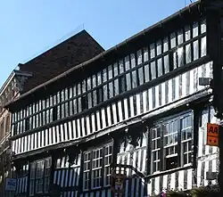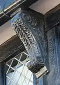 The Crown Hotel is a black-and-white, timber-framed and plaster three-storey building with a tiled roof.[1] The street-facing front, described by Nikolaus Pevsner as "impressive", is flat and features close studding with a middle rail.[6][18] Unlike many buildings of a similar date in the town, it lacks ornamental panelling.[18] Each storey has small overhangs, with carved corbels (brackets).[1] All three storeys have restored mullioned and transomed windows in oak.[1] The second (top) floor features unusual continuous windows along the entire front.[1][6][19]