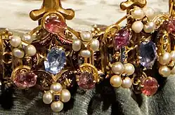 The crown is made up of 12 hexagonal rosettes on the base each supporting a gold stem topped by a lily. The stems and lilies alternate in size and height. They are heavily jewelled versions of the fleur de lys (lily flower) that was popular for medieval crowns.[3] In the middle of the hexagons, which have enamelled white flowers overlaid onto a translucent blue or red background, is a pale blue sapphire, 11 of which are oval and 1 is hexagonal. Each point is decorated with alternating rubies and clusters of four pearls that have a small diamond at the centre. In addition to diamonds, pearls, and sapphires, the lilies are also decorated with emeralds.[4]