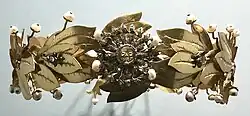 The crown, which measures 7.5 x 22 cm and weighs about 762 grams,[5] is adorned with 47 gold laurel leaves which give it the appearance of a laurel wreath, itself a symbol of triumph in Ancient Greece and Ancient Rome. The crown is adorned with 49 baroque pearls, 9 diamonds, 274 diamond sparkles, and 10 gold beads.[6]