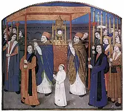 The Croxton Play of the Sacrament is the only surviving English Host miracle play.[1] The play centers around the abduction of a Eucharistic Host by a group of Jewish men, and the series of miracles that lead to their conversion of Christianity.